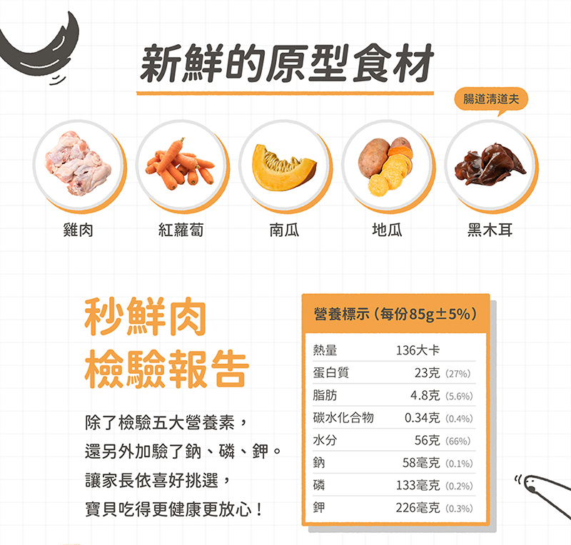 【成分】雞肉、地瓜、南瓜、黑木耳、紅蘿蔔
